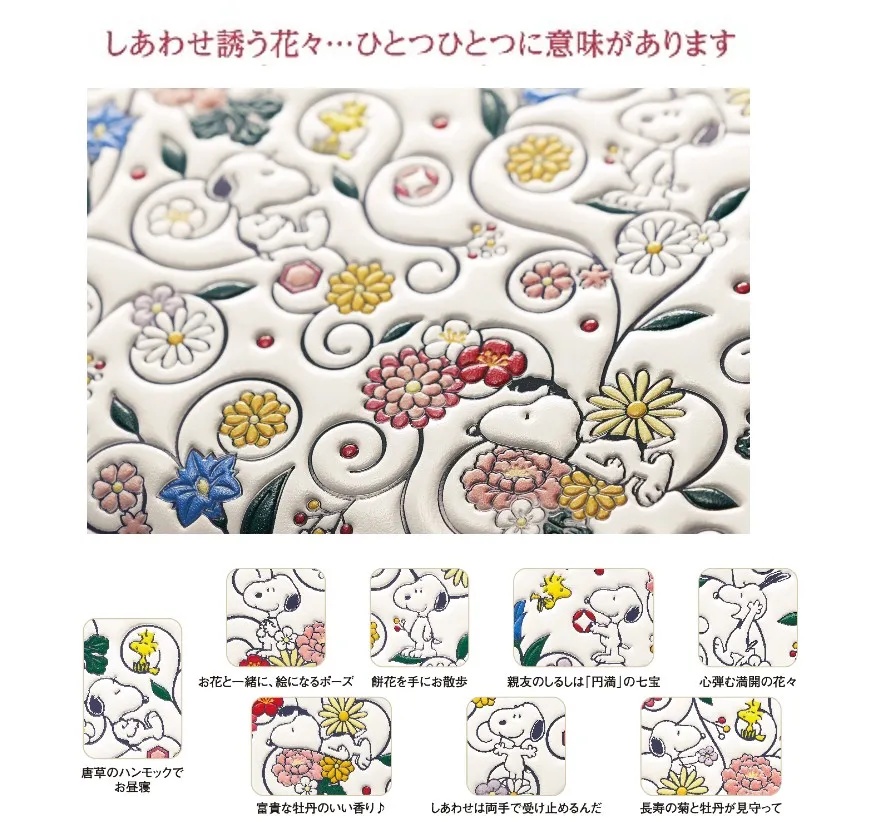 浅草文庫長財布<スヌーピーしあわせの花唐草>新登場! 播播州姫路特産の白革に、色鮮やかな友禅染めの逸品が誕生しました。