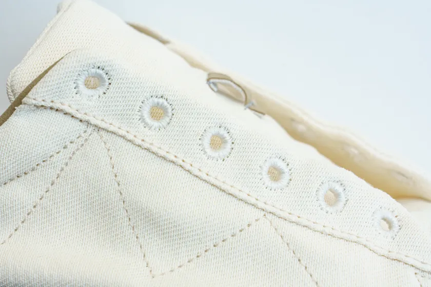 和紙の糸からアイレットを成形しており金具を使用しないことで生分解性の阻害をしないだけでなく「金具が当たって足当たりが痛い」など靴本来の悩みも解決。