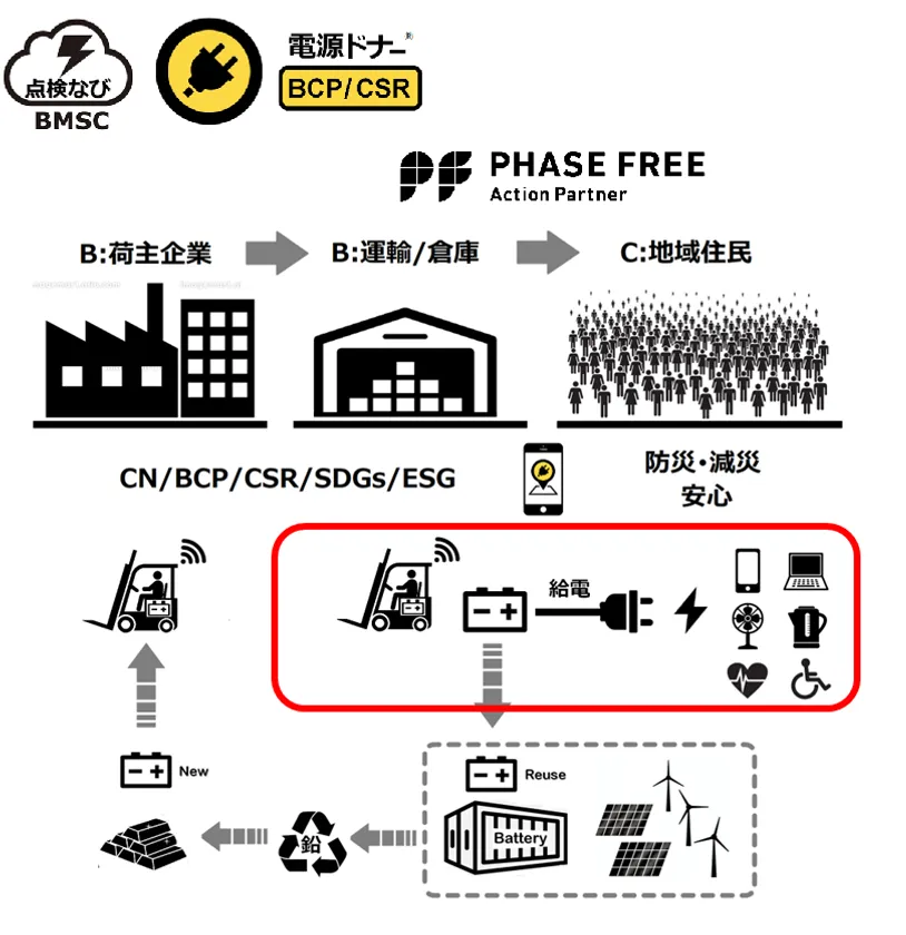 *電気自動車による災害時の給電利用を法人が使用する電動フォークリフトでCSRとして実現