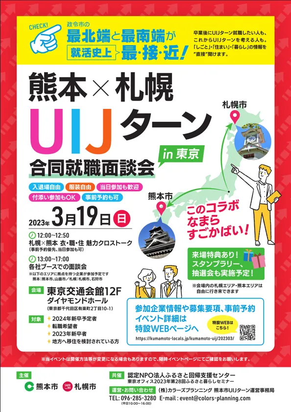 熊本市(業務受託会社:株式会社カラーズプランニング)は、「熊本×札幌 UIJターン合同就職面談会 in 東京」を2023年3月19日(日)、有楽町・東京交通会館にて開催します。