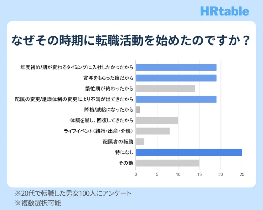 転職活動を始めた時期については、「特になし」が最も多く、転職時期にこだわりがない方が多いことが分かりましたが、それ以外では「年度初め/期が変わるタイミング」「賞与をもらった後」「配属の変更/組織体制の変更」が多くなりました。