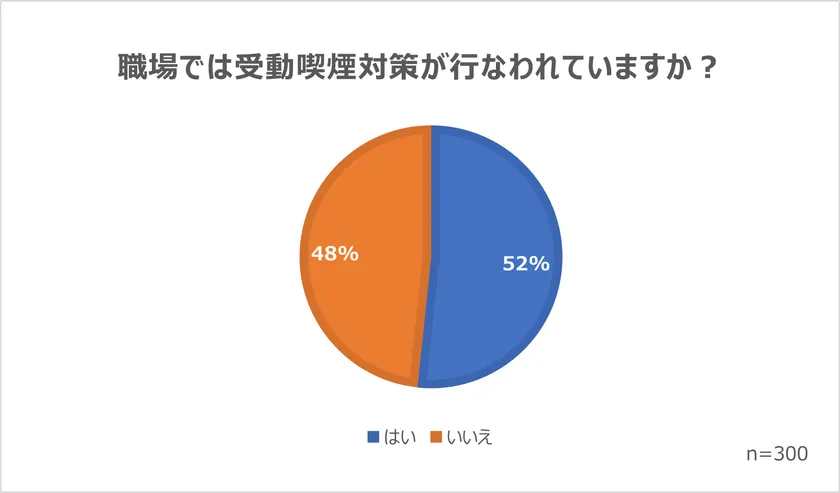 アンケートで「職場では受動喫煙対策が行なわれているか?」という質問を実施したところ、「はい」が52%、「いいえ」が48%であり、おおよそ半々の結果となりました。