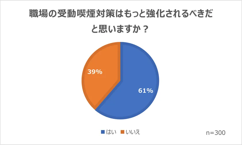その一方で、6割を超える方が「職場の受動喫煙対策はもっと強化されるべき」と回答していることを考慮すると、今後はさらなる対策が求められるといえるでしょう。
