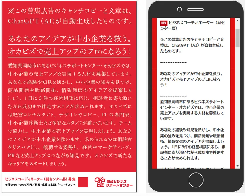 岡崎ビジネスサポートセンター・オカビズ(所在地:愛知県岡崎市、センター長:高嶋 舞)は、米企業が開発した人工知能「ChatGPT(チャットGPT)」が自動生成した文章を広告に起用し、2023年3月7日(火)より相談員を募集します。人工知能が生成した文章で求人を行うのは、公的機関としては全国初(オカビズ調べ)。オカビズの相談員はビジネスのトレンドに敏感であることが求められるため、話題の技術をいち早く活用することで同様の習慣・能力を持った人材に訴求することが狙いです。応募は募集ページより可能で、締切は4月12日(水)までとなります。