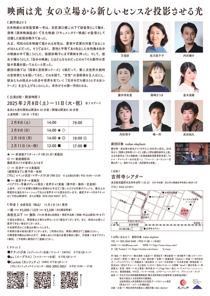 劇団印象-indian elephant- 第32回公演『女性映画監督第一号』が2025年2月8日 (土) 〜 2025年2月11日 (火・祝)に吉祥寺シアター(東京都武蔵野市吉祥寺本町1-33-22)にて上演されます。