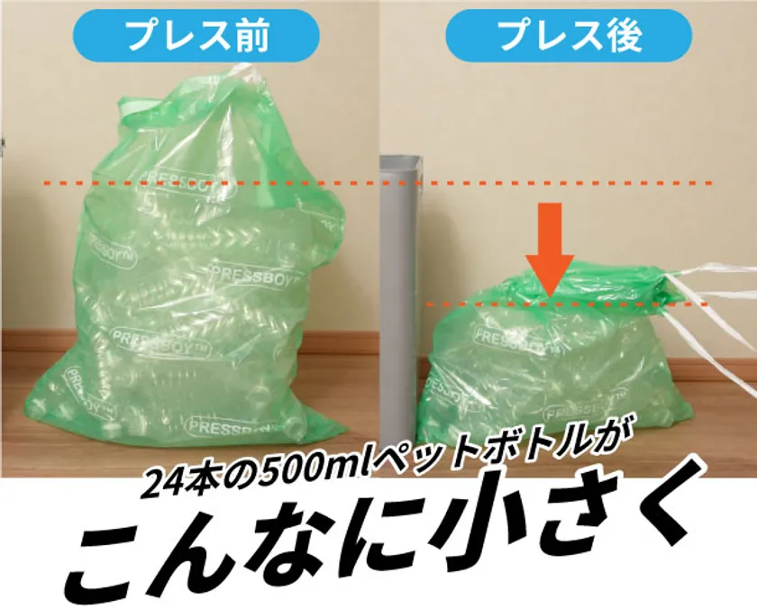 ゴミの内容によって圧縮率は変わりますが、ペットボトルでさえこんなに小さく省スペースに!