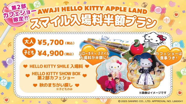 株式会社パソナふるさとインキュベーションが運営する、株式会社サンリオのキャラクター「ハローキティ」をテーマにした施設「AWAJI HELLO KITTY APPLE LAND」では、メディアアート&レストラン「HELLO KITTY SMILE」やシアターレストラン「HELLO KITTY SHOW BOX」などハローキティをテーマにした各施設をお得にお楽しみいただける期間限定の『スマイル入場料半額プラン』を9月9日(火)より販売いたします。