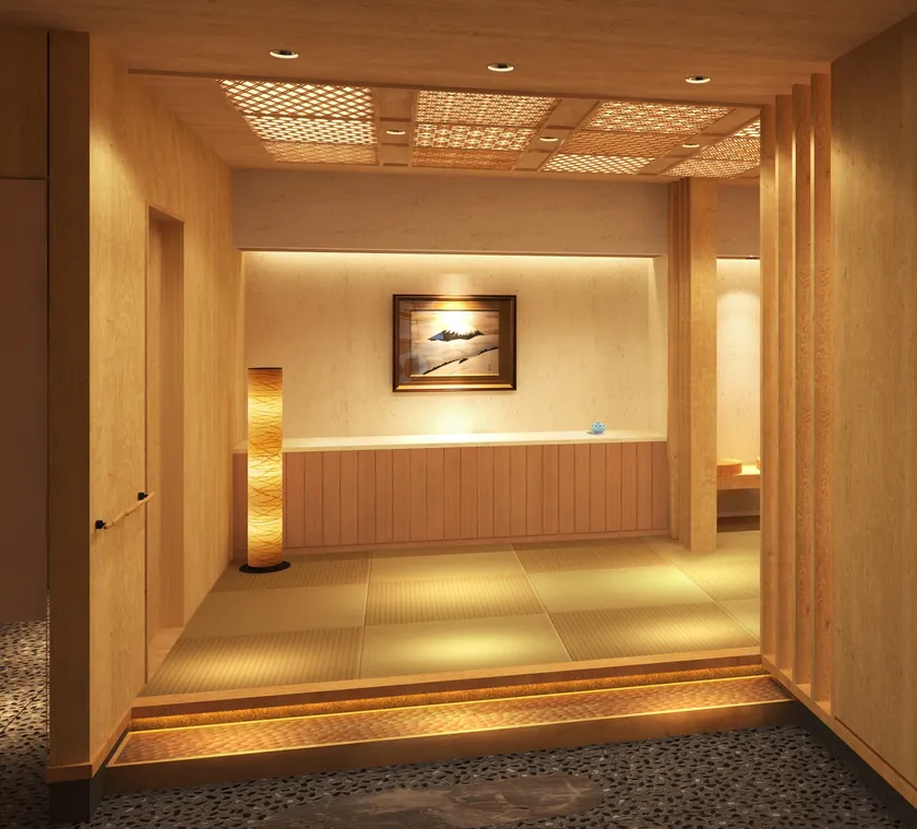 外観は150余年の歴史と伝統の趣を表現しつつ高級感あふれる造りで、足を踏み入れると、日常から離れた特別な空間へと誘うアプローチが続きます。エントランスは板の間から畳敷きとなり、温かみがありながら洗練された空間は、至福のひとときへの期待感が高まる設えです。