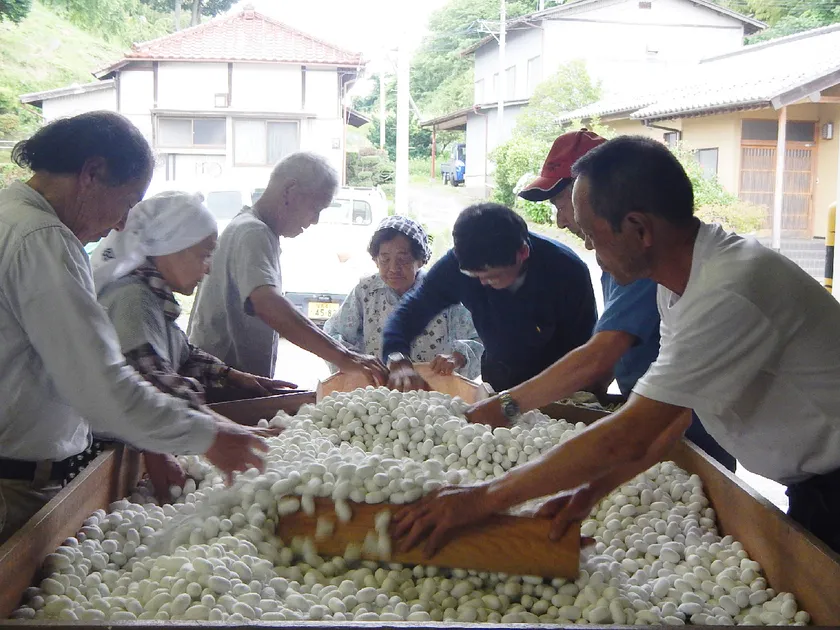 ・日本の蚕糸文化・産業を守ります:日本で流通する絹製品のうち、純国産絹はわずか0.3%といわれています。最盛期の1万分の1以下の生産量ですが、世界全体では、天然繊維の需要は拡大し、繭生産も増加傾向です。