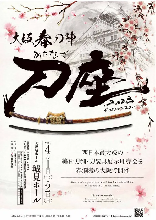 刀座実行委員会は、産経新聞社後援にて2023年4月1日・2日、全国から40社の刀剣商が大阪城の麓に集まって刀剣・刀装具の展示即売フェア「大坂春の陣 刀座2023」を開催します。
