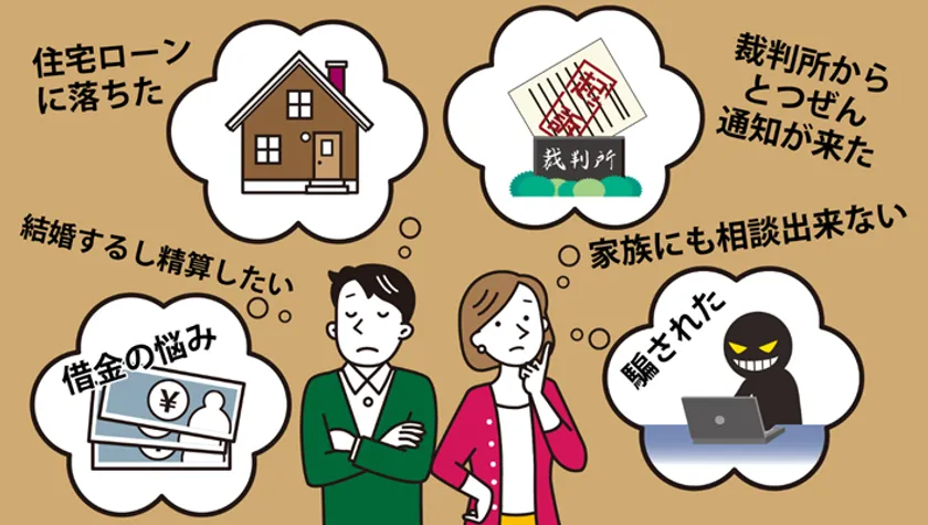 裁判所から突然通知が送られてきた・詐欺に合った・過去の借金でどうしたら良いか分からない、住宅ローン対策、違法な取り立てなどのデリケートな問題に対応しています。