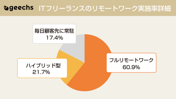 ITフリーランスのリモートワークの実施率は、82.6%となりました。「フルリモートワーク」が60.9%、リモートワークと顧客先への常駐を併用した「ハイブリッド型ワーク」が21.7%となっています。一般的なリモートワークの実施率は、9月時点で23.2%(※2) となる中、ITフリーランスに関しては約60pt高い実施率となっています。