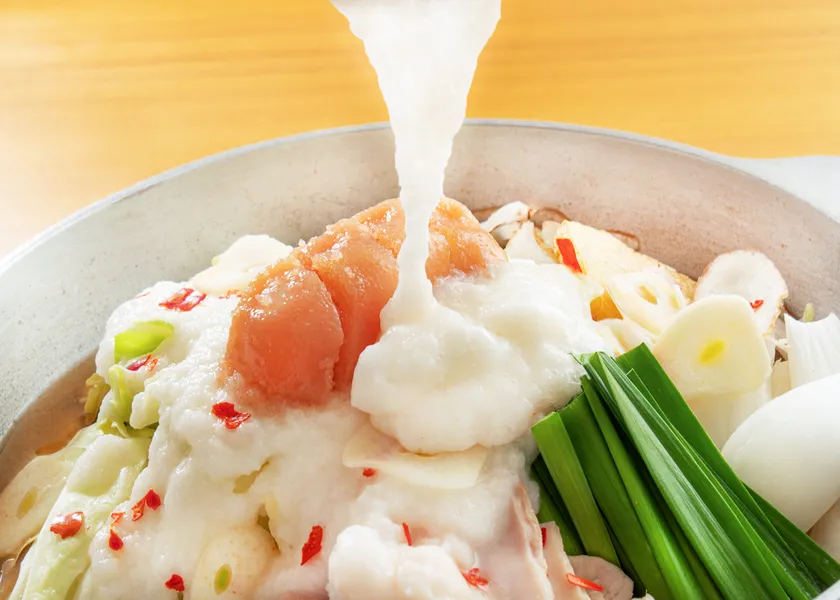 あごだし醤油味のスープをベースに、昆布だしを合わせた特製スープを使用し、国産牛もつ、新玉ねぎ、じゃがいも、キャベツ、ニラ、ごぼうなど旬の野菜を加え、仕上げにとろろとやまやの辛子明太子を添え、贅沢に仕上げました。