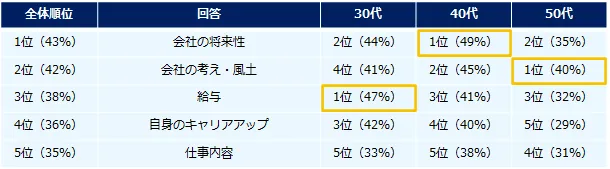 ★ 転職を考えたきっかけ第1位は、30代「給与」、40代「会社の将来性」、50代「会社の風土」。