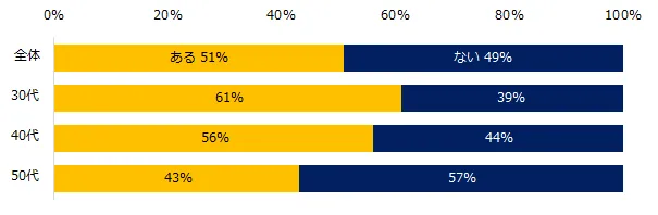 若手時代(20代)に転職の経験があるか伺うと、51%のミドルが「ある」、49%が「ない」と回答しました。年代が高くなるにつれて、20代での転職経験がないミドルが増える結果となりました。