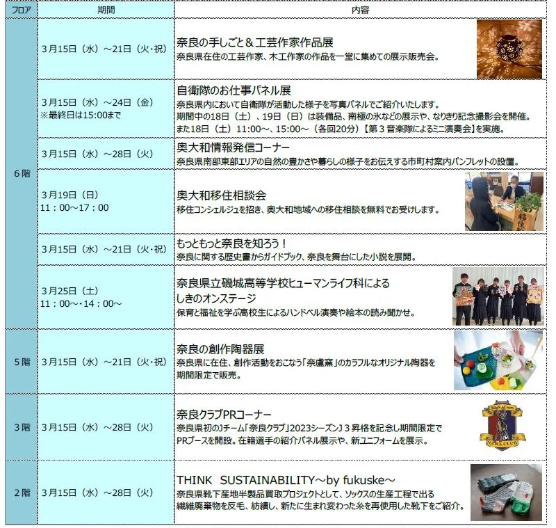 各階に奈良の物産コーナーや体験コーナーを設けます。