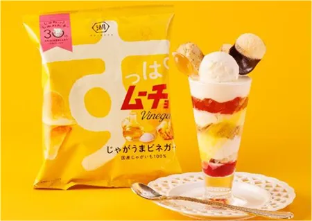 酸味が甘味を引き立たせたバランスのよい新感覚のパフェです。「すっぱムーチョじゃがうまビネガー」とバニラアイス、マスカルポーネクリーム、フランボワーズソース、白ワインビネガーのゼリーによるすっきりとした味わいです。