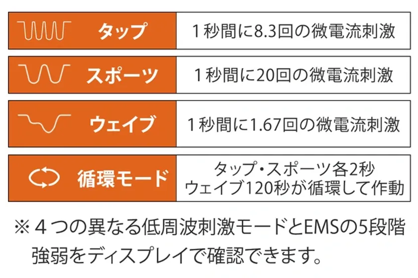 4つの異なる微電流の刺激と5段階の強度を選べます。