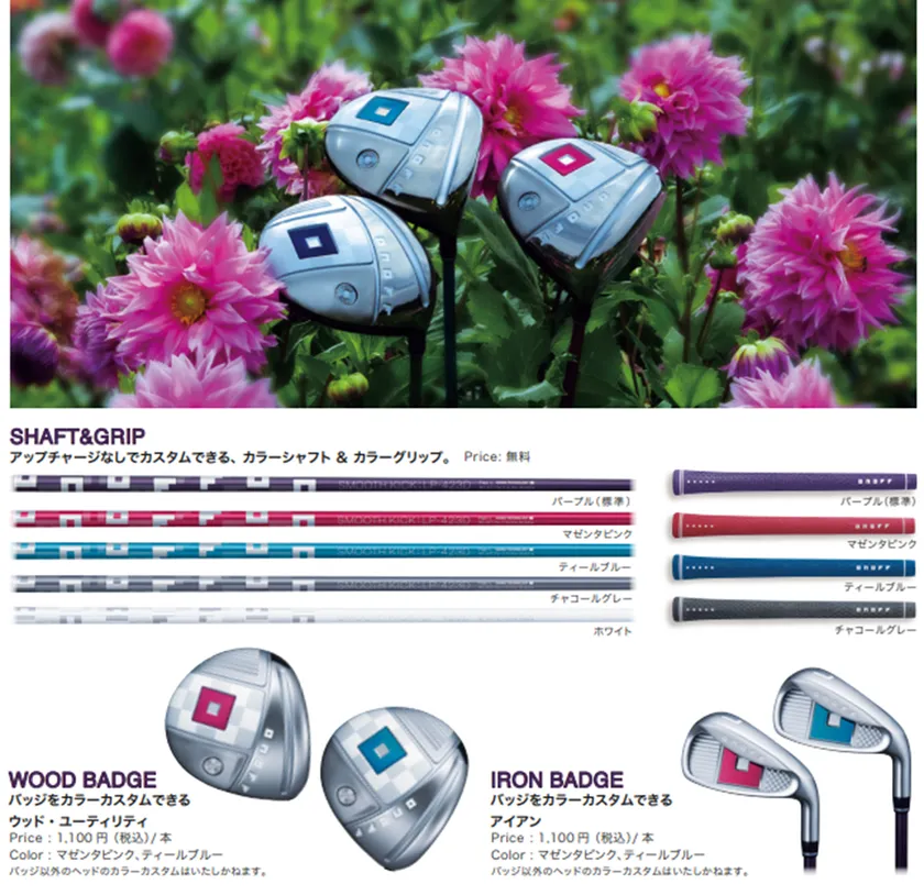 シャフト5色、グリップ4色、ヘッドバッジ3色からカラーカスタムすることができ、自分だけのオリジナルなクラブができる。