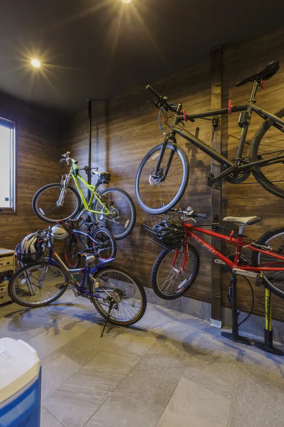 5人家族全員が自転車を持っているN様一家は、土間収納を内自転車置き場として利用しています。複数の自転車を壁に掛けることで、スペースもスッキリ。壁と天井には、妻・Y様のアイディアで木目調のクロスを貼っていて、自転車を壁掛けしても、汚れが目立ちにくく、拭きやすくなっています。