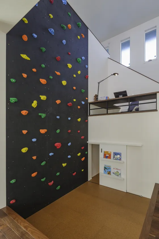 床面を下げたピットリビングによって、約4メートルの高さを実現。手足でつかむ色とりどりのクライミングホールドは、ボルト留めで位置を変えられるため、子どもの成長に合わせて難易度を調整することができます。子どもたちが小さかった頃は、落ちてもケガをしないよう下にマットを敷き詰めていましたが、今では三男のYくんも一番上まで登れるそうです。また、大人の使用にも耐えられることから、親子でも楽しんでいると言います。