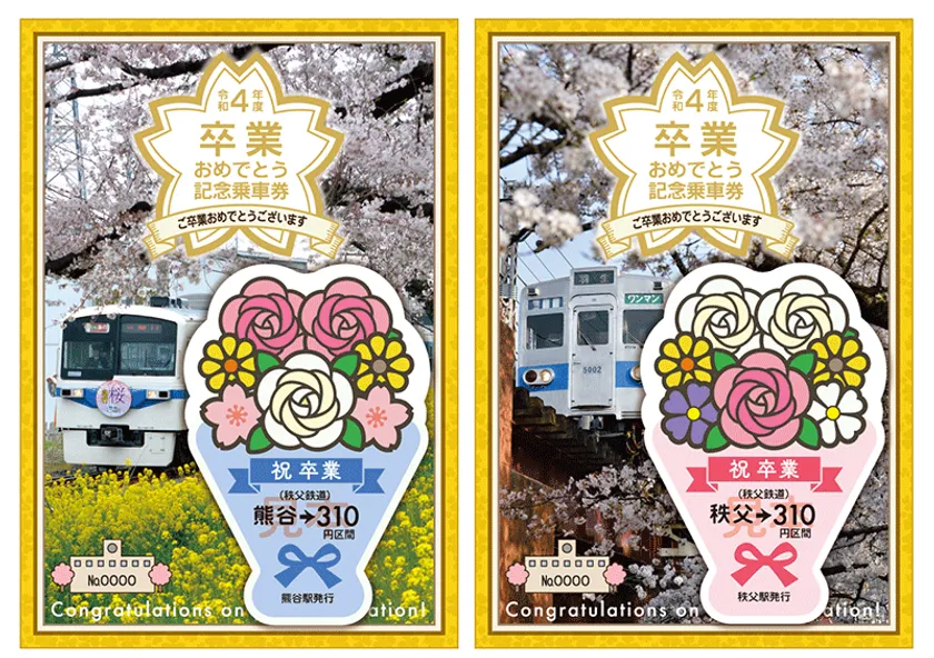 秩父鉄道株式会社(本社:埼玉県熊谷市、代表取締役社長:牧野 英伸)では、高校への通学に秩父鉄道をご利用いただいた卒業生へ「おめでとう」のメッセージと、3年間通った秩父鉄道の思い出を忘れないでほしいという思いを込めた「卒業おめでとう記念乗車券」を2023年3月4日(土)~31日(金)まで期間限定で販売いたします。デザインは、2種類。高校卒業の記念、一緒に通ったご友人とお揃いでご購入される等にぴったりな記念乗車券です。詳細は、下記のとおりです。