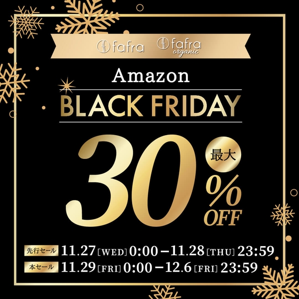 オーガニックライフスタイルブランド「fafra(ファフラ)」「fafra organic(ファフラオーガニック)」(株式会社G.Oホールディングス:大阪府大阪市)は、11月27日〜12月6日の期間中【Amazon ブラックフライデー】にて一部対象アイテム《最大30%OFF》を実施いたします。