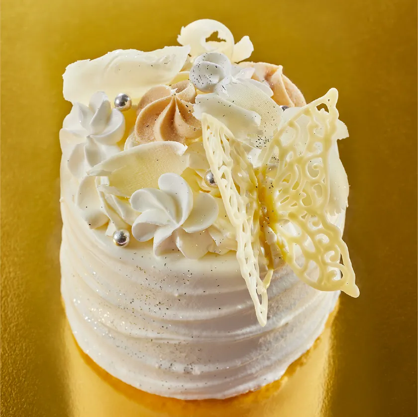 ふわふわのスポンジに苺と生クリームをたっぷりサンドしたショートケーキの上には、ベルギー産の濃厚なキャラメルチョコレートクリームとバタークリームのお花をたっぷりと。ホワイトチョコレートで出来た蝶々は一点一点手作りです。
