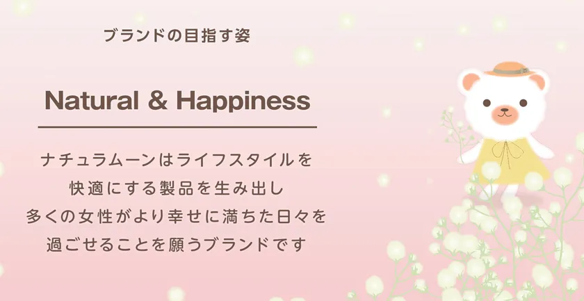 ナチュラムーンは2011年に日本初の“コットン100%のトップシートと高分子吸収材不使用を両立した生理用品※”として誕生したブランドです。『ナチュラル&ハピネス』をキーワードにサニタリーグッズ、化粧品、アパレル、入浴剤、洗剤などを開発しています。製品開発の原動力は愛用者の皆様から湧き出る「こんな製品があれば良いのに…」という想い。ナチュラムーンは愛用者の皆様と一緒に発展していくことをめざしています。