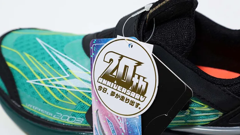 デザインモチーフは未来志向の機能と独創的な形のリニアモーターカー。20周年記念モデルとしてアッパー(甲)には「2003-2023」、ナイロンテープ(甲)には「20th Anniversary」のサインをあしらっています。「瞬足JJ-055」の特長は5つ。