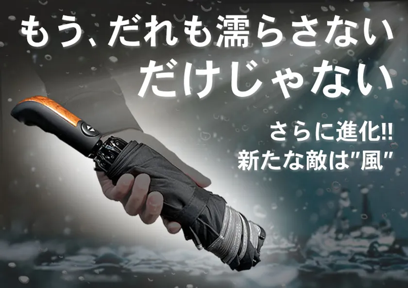雨の日の通勤を少しでも快適にするために“だれも濡らさない”を追求した新しい折りたたみ傘です。最新作では「風が強い日に濡れる…」と、以前からの課題であった点を改良。横風を右から左へ受け流すウィンドリリース機能を搭載しました。