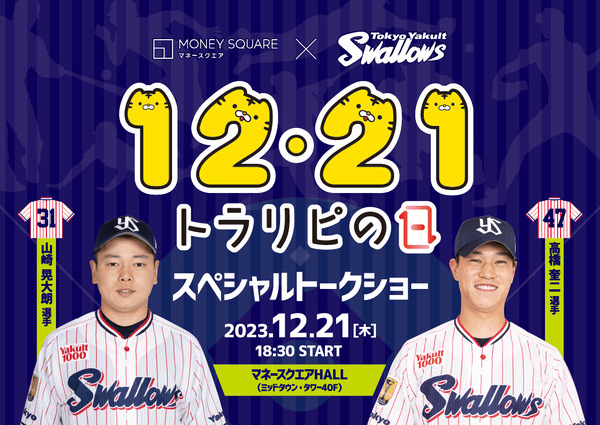制定後、初の「トラリピの日」となる2023年12月21日には、当社がオフィシャルスポンサーを務め、勝利のために日々挑戦し続ける東京ヤクルトスワローズの高橋奎二選手と山崎晃大朗選手をお招きし、記念日の意味合いでもある「リピート」をテーマに、野球人生のなかでリピートしている習慣や、シーズンを振り返り、リピートさせたい印象的なプレーや試合など、来シーズンへの期待も込めたトークイベントを開催致します。