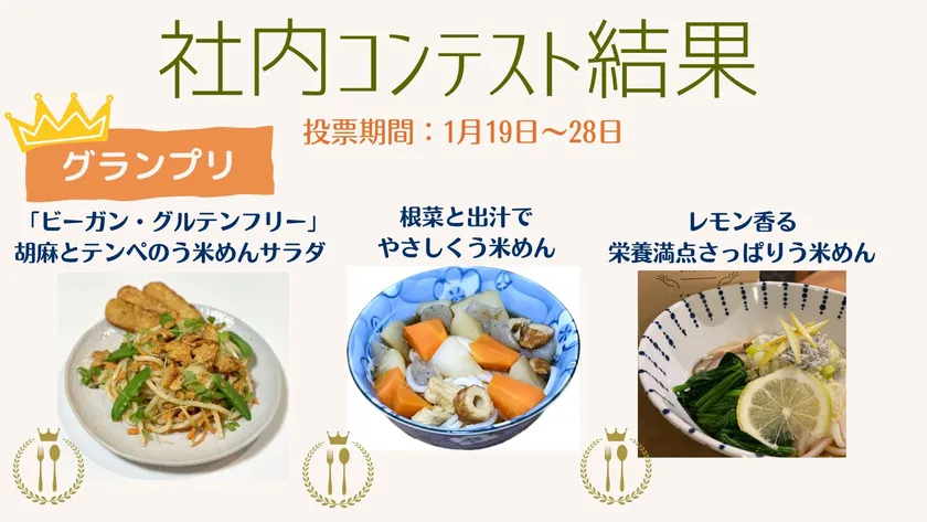 今回のコンテストにエントリーした社員は10名で、一人暮らしをする若い世代から子育て中の母親など男女問わず多様な社員が工夫を凝らしたレシピを考案しました。コンテストは社内スタッフによる投票形式で、3名がグランプリに輝きました。1名は20代の若手社員で「根菜と出汁でやさしくう米めん」。その他2名は子育て母親社員で「ビーガン・グルテンフリー胡麻とテンペのう米めんサラダ」と、「レモン香る栄養満点さっぱりう米めん」でした。「根菜と出汁でやさしくう米めん」は名のごとく根菜がたっぷりで優しい出汁でいただく寒い時期に最適なアイデアでした。「ビーガン・グルテンフリー胡麻とテンペのう米めんサラダ」は大豆発酵食品「テンペ」を活用しサラダ感覚で食べられるアイデア、「レモン香る栄養満点さっぱりう米めん」は野菜としらすを活用した栄養価が高く手軽に作れるアイデアでした。どれも「美味しそう」で「身体に良さそう」という意見からこれらの3つのレシピがグランプリに選ばれました。