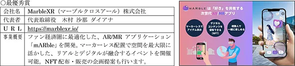 最優秀賞を受賞した「MarbleXR株式会社」は、ピッチテーマの一つである「安全でクリエイティブな都市生活、スマートでウェルネスなまちづくりの実現」に、寄与する可能性が高く評価されました。