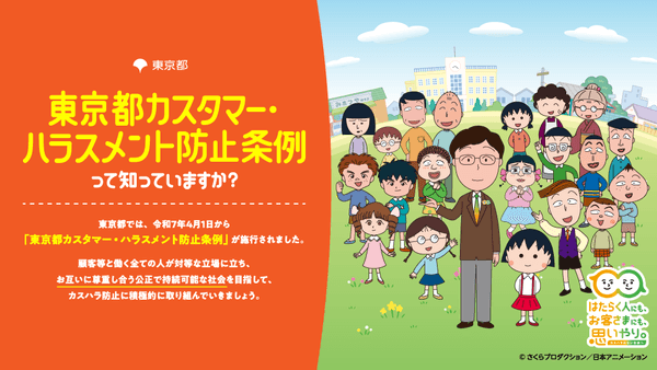 「カスタマーハラスメント(カスハラ)」とは、顧客等から就業者に対する著しい迷惑行為であり、就業環境を害するものをいいます。東京都では、2025年4月に「東京都カスタマー・ハラスメント防止条例」が施行され、顧客等と働く全ての人が対等な立場に立って、お互いに尊重し合う公正で持続可能な社会を目指しています。今回、カスタマー・ハラスメント防止対策に関する普及啓発を『ちびまる子ちゃん』がお手伝い!オリジナルキャラクターとして、カスハラのない社会を目指しているカスハラの専門家「思いやり先生」(CV.石田彰)も登場します。