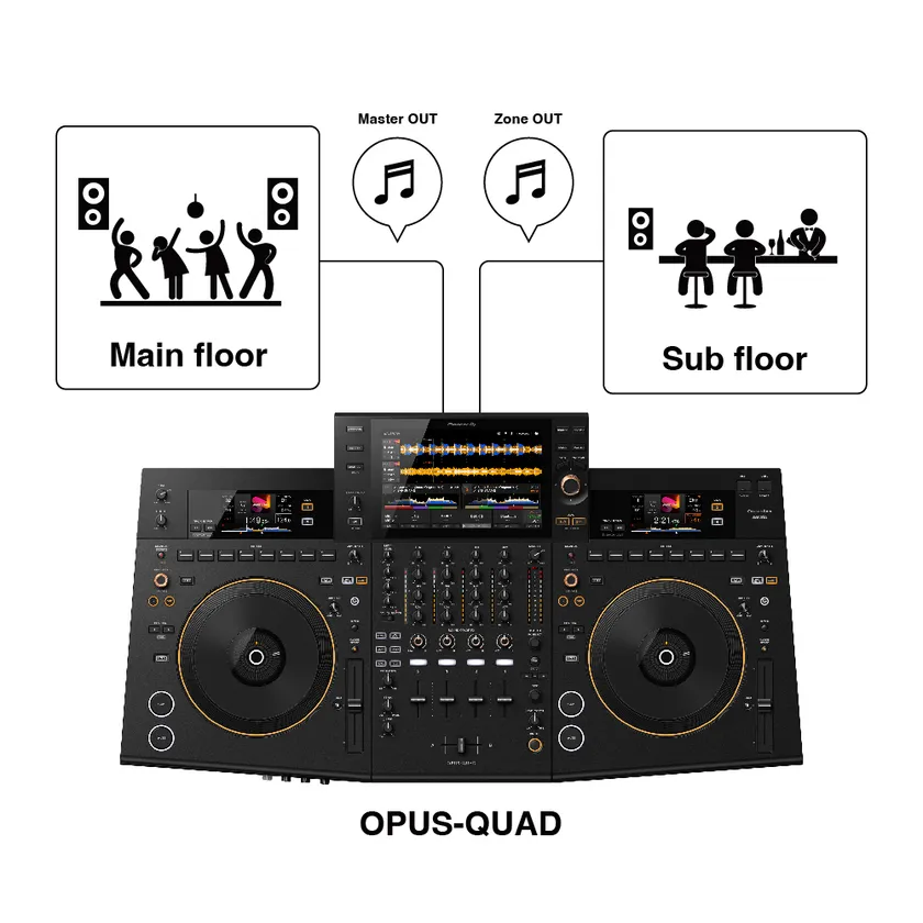 本機では、MASTERとは異なる音を出力できるZONE出力を備えており、フロアによって異なる音楽演出を行うことができます。例えばBluetoothオーディオ入力と組み合わせることで、メインフロアにはUSBを使用したDJプレイ、サブフロアにはモバイルデバイスからBluetooth入力したBGMを出力するなど、それぞれのフロアにマッチした音楽演出をOPUS-QUAD1台で完結することができます。