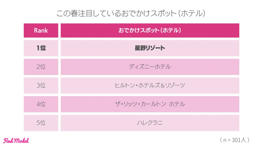 インフルエンサーがこの春に注目しているホテル1位は【星野リゾート】という結果になりました。2位【ディズニーホテル】、3位【ヒルトン・ホテルズ&リゾーツ】が続きました。