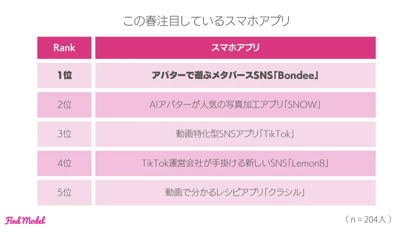 この春インスタグラマーが注目しているスマホアプリ1位は、冬にダウンロードしたもの4位に入った【Bondee(ボンディー)】となりました。その他ランクインアプリは、すでに人気のアプリが揃う結果となりました。