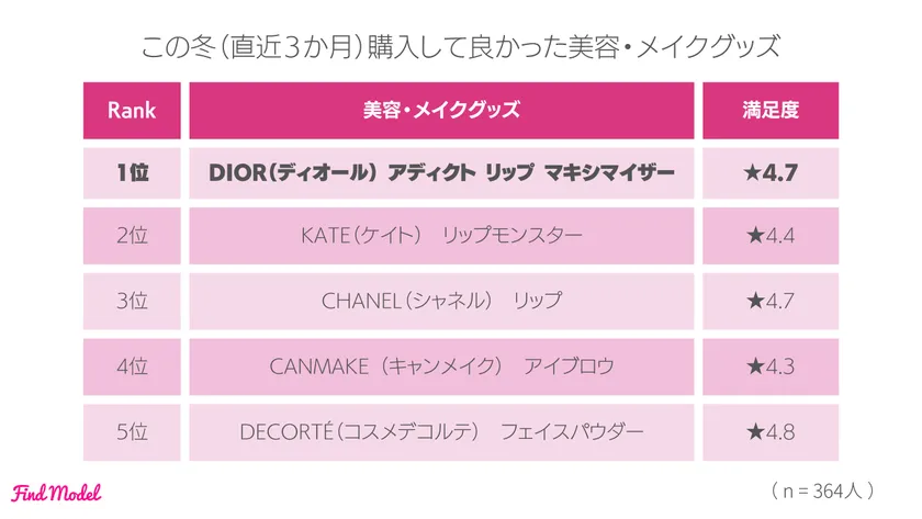 この冬インスタグラマーに購入された美容・コスメアイテムは【DIOR(ディオール)アディクト リップ マキシマイザー】となり、過去3回のアンケートに続き連続で1位はDIORでした。満足度も5点満点中4.7点と高い結果となりました。使用した感想としては「使い心地は変わらずパッケージが可愛くなりカラバリが増えて大満足です!(30代女性・1.3万フォロワー)」「唇のシワが一瞬にして無くなるので重宝しています(30代女性・6.6万フォロワー)」と、何度もリピートしている方の声が多く見られました。
