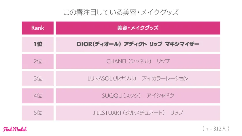 また、この春インスタグラマーに一番注目されている美容・コスメアイテムは、この冬に購入して良かったコスメと同じく【DIOR(ディオール)アディクト リップ マキシマイザー】となりました。そして2位に【CHANEL(シャネル)リップ】、3位に【LUNASOL(ルナソル)アイカラーレーション】が続きました。