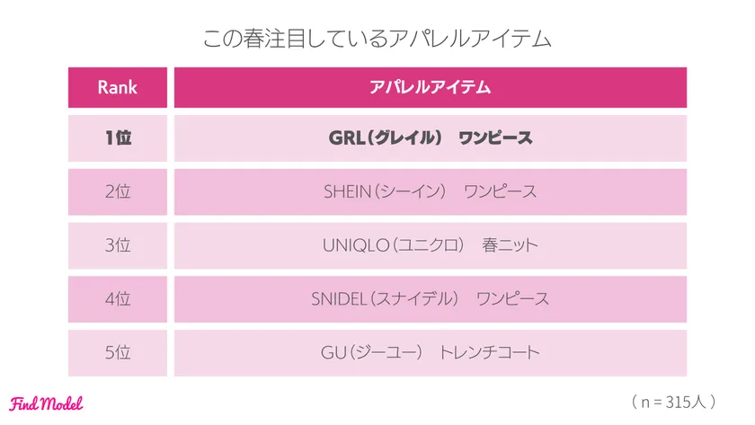 また、この春インスタグラマーに注目されているアパレルグッズとしては、【GRL(グレイル)ワンピース】が一番多く、続いて【SHEIN(シーイン)ワンピース】【UNIQLO(ユニクロ)春ニット】という結果となりました。