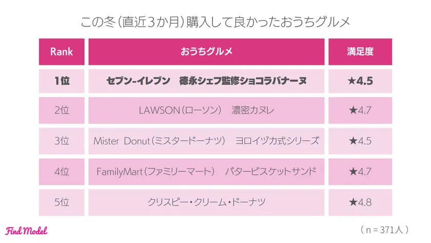 この冬インスタグラマーが購入して良かったおうちグルメは【セブン-イレブン 徳永シェフ監修ショコラバナーヌ】が1位となり、2位に【LAWSON(ローソン) 濃密カヌレ】、3位に【Mister Donut(ミスタードーナツ) ヨロイヅカ式シリーズ】となりました。