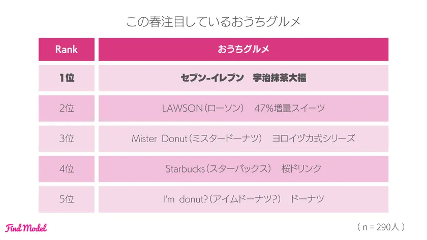また、この春インスタグラマーに最も注目されているおうちグルメは【セブン-イレブン 宇治抹茶大福】となり、この冬に購入してよかったおうちグルメと同じくセブン-イレブンの商品が1位となりました。
