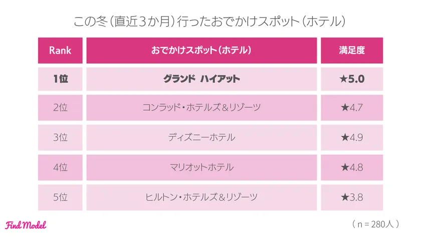 また、この冬インスタグラマーが行った宿泊施設1位は【グランド ハイアット】となりました。「安定の高級感(40代女性・3.6万フォロワー)」「ラグジュアリーで非日常感を味わえた(30代女性・2.3万フォロワー)」等、前回のアンケートと同様に非日常が味わえる雰囲気についてのコメントがありました。