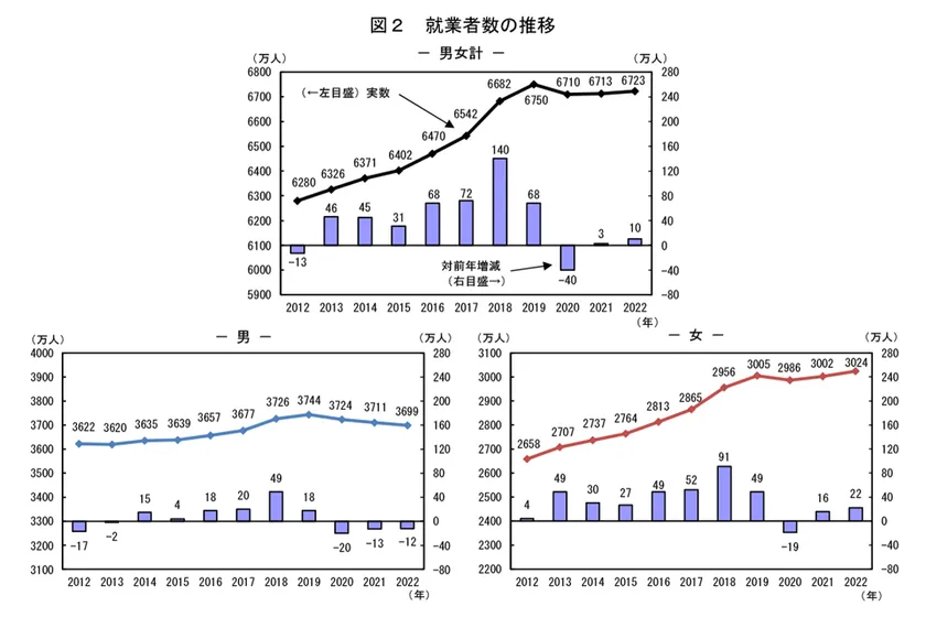 2022年7月、女性活躍推進法に関する制度改正により、「男女の賃金の差異」が情報公表の必須項目になるなど、日本国内において、女性の社会進出を支援する制度が徐々に整備されつつあります。その結果、2022年の女性の就業者数は3,024万人と、前年よりも22万人増え、コロナ禍の真っ只中であった2020年を除いて、年々増加傾向にあります。