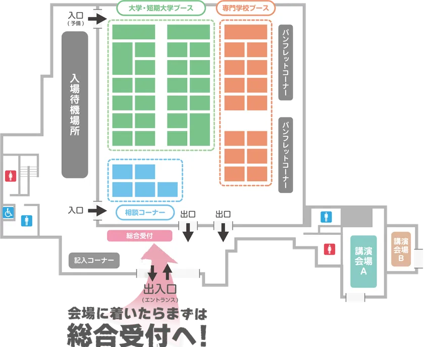 当日、お呼びしている大学、短期大学、専門学校の入学相談アドバイザーが一堂に会し進路や受験についての悩み、不安に感じていること、受験当日までの心構えや入学してからの学園生活など、様々な角度から適切なアドバイスをしてくれる相談会です。また、各種相談コーナーには専門的知識をお持ちのアドバイザーの方々が分かりやすくアドバイスをしてくれます。