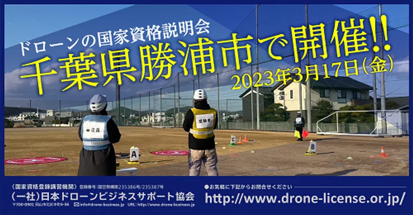 一般社団法人日本ドローンビジネスサポート協会 東京第5支部(所在地:東京都多摩市)は、2022年12月より開始された「無人航空機操縦者技能証明」制度(いわゆる「ドローン免許制度」)について制度概要・取得方法などを解説する「ドローンの国家資格説明会」を、2023年3月17日(金)に「千葉県勝浦市」にて開催いたします。