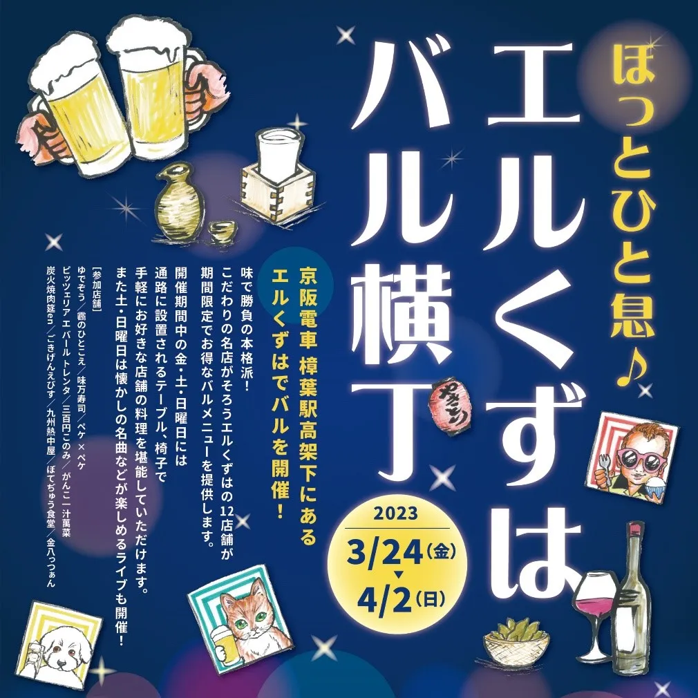 株式会社京阪流通システムズ(本社:大阪市中央区、代表取締役社長:松下靖)が運営する京阪電車 樟葉駅の高架街「エルくずは」(大阪府枚方市楠葉花園町14)にて、2023年3月24日(金)から4月2日(日)まで「ほっとひと息♪エルくずは バル横丁」を開催いたします。