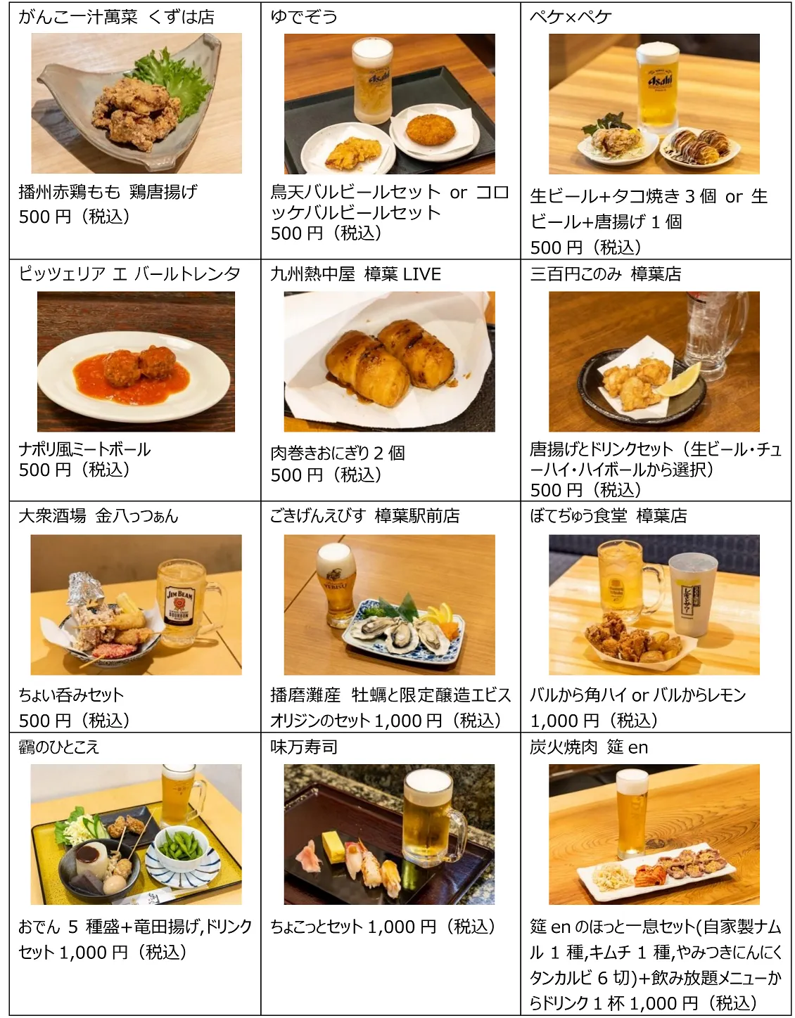 期間中、エルくずはの飲食店12店舗が参加し、500円(税込)もしくは1,000円(税込)というリーズナブルな価格で、おいしい料理とお酒が楽しめるお得なバル限定メニューを提供いたします。気になるお店を気軽に“はしご酒”していただき、まだ行ったことがない店舗への来店のきっかけにしていただくことを目的としています。