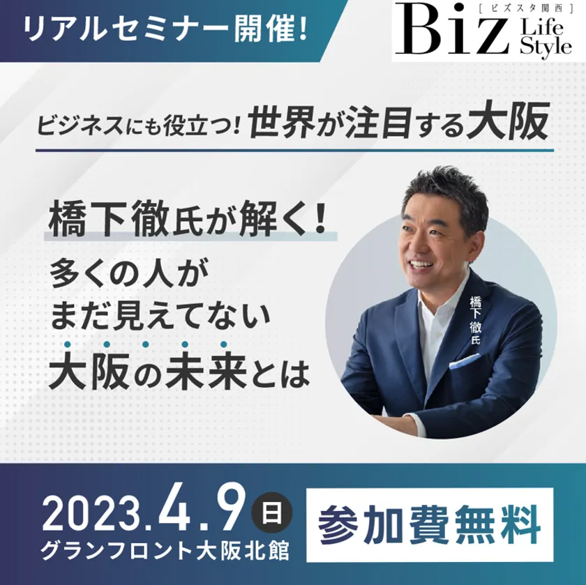 ビジネスパーソンのためのライフスタイル情報誌「Biz Life Style」(株式会社デイリー・インフォメーション関西)は、2023年1月、元大阪府知事・元大阪市長の橋下徹氏が登壇しBiz Life Styleセミナーを初開催。続く2月の東京開催も大好評につき終了しました。そして早くも第3弾が、4月9日大阪・梅田の地で開催いたします。